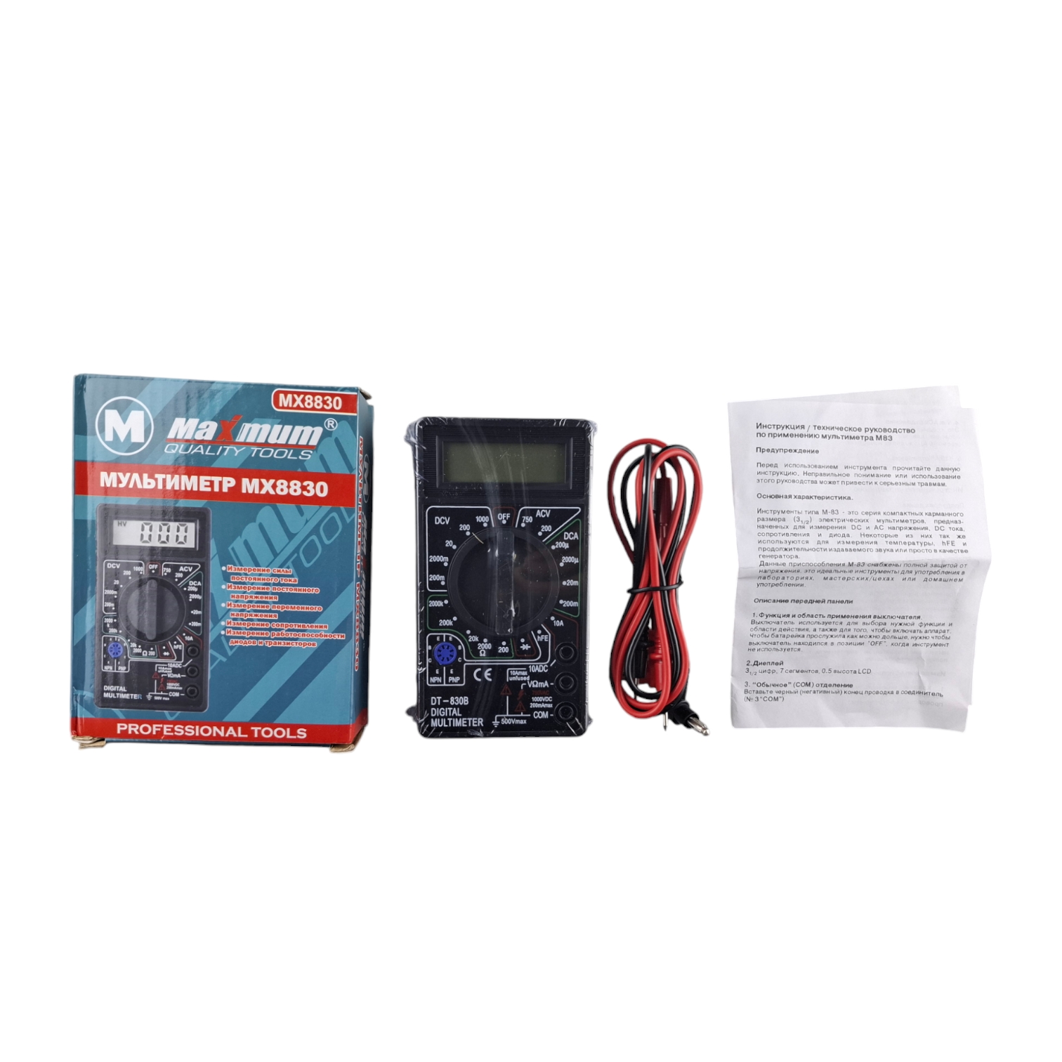 Digital Multimeter DT 830B подходит для измерения напряжения в электрической сети между двумя точками, сопротивления, значений тока. С его помощью можно проверить на целостность полупроводниковый диод, определив его напряжение, прозвонить электросхему при сопротивлении до 5 Ом, протестировать полупроводниковый транзистор, измерить индуктивность и электрическую емкость. Измеритель емкости и индуктивности имеет ЖК-дисплей и низкое энергопотребление и даже при ярком солнце показывает четкое изображение.